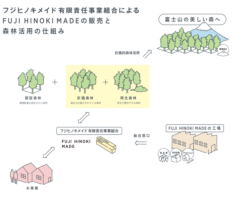 富士ひのきは、富士山麓の森林資源の持続的な活用と環境保全に貢献し、適正な森林経営を通じて生産されています。