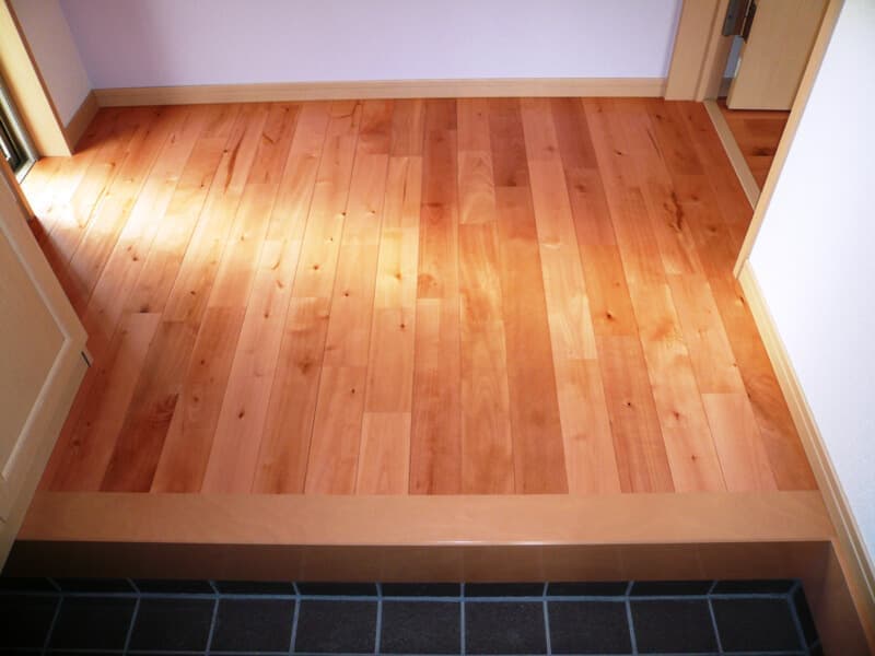 床板すべてに国産のサクラの無垢材を使った家。床に日の光が当たると、室内全体があたたかみのある雰囲気になります。同じサクラでも、例えば階段と廊下の床板は違う樹種。そのため色合いに変化があります。