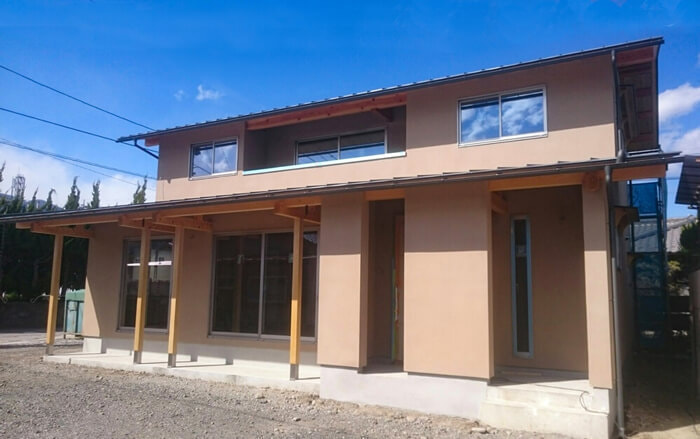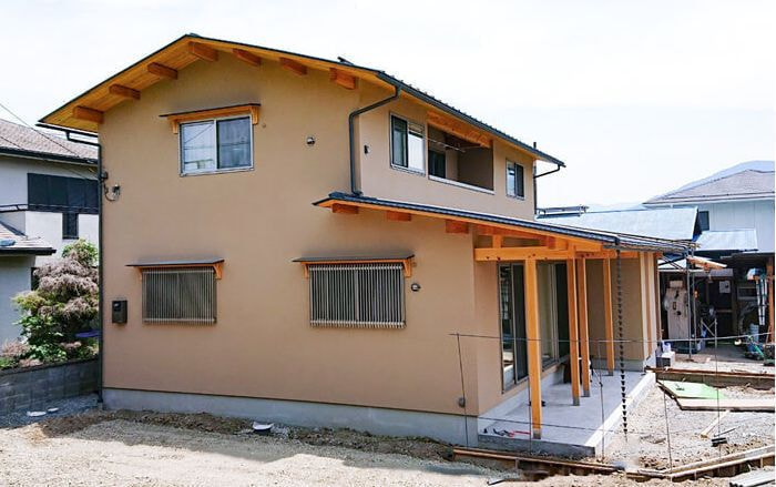 5人家族の住まいの新築(建て替え)。南向きに軒を深く取っています。構造材には全て国産材を用いており、軒裏にはスギを使用。1階、2階ともに屋根にわずかなむくり(丸み)を入れています。