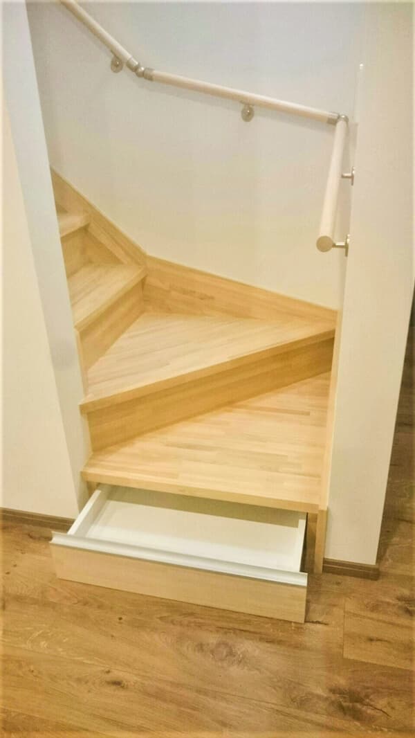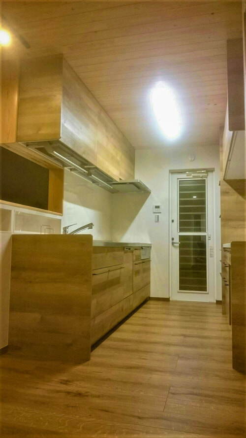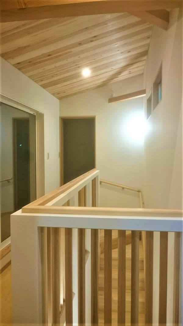 家を建てる前に施工例として他のお宅を見学していただいたのですが、その際、無垢材の天井を気に入っていただき、結局全ての天井をスギ、ヒノキの無垢材にすることに。無垢木の断面を見せた大黒柱や、手づくりの階段手すりも含め、とても喜んでいただきました。キッチンは独立させ、生活感があらわにならないつくりにしています。