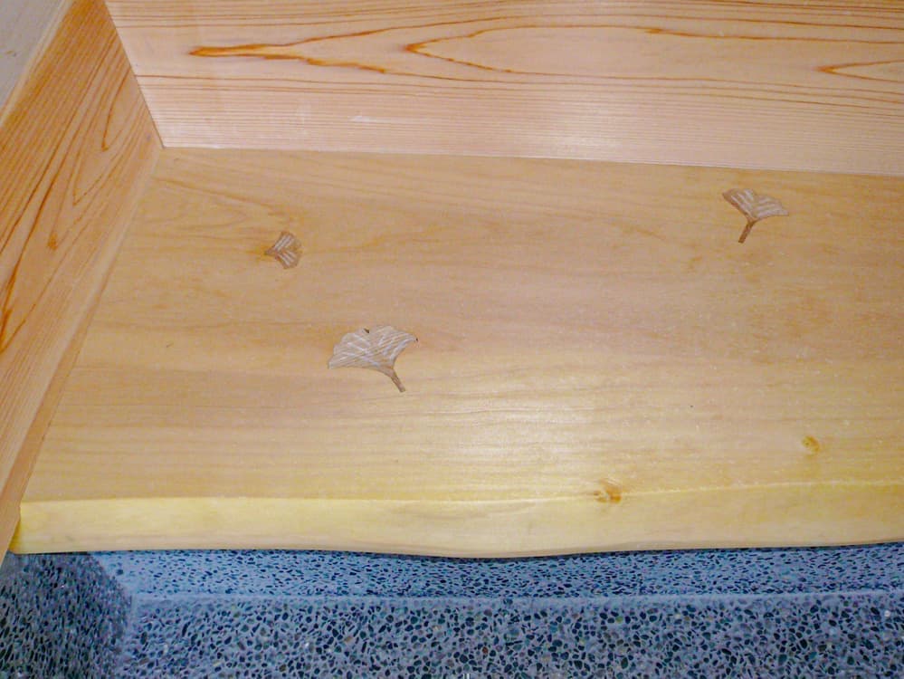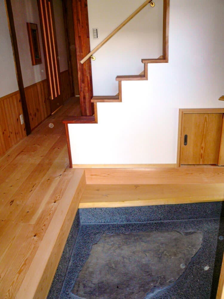 玄関の框(かまち)の敷石には古材を使用。式台の材はイチョウで、節の埋め木にイチョウの形を用いています。
