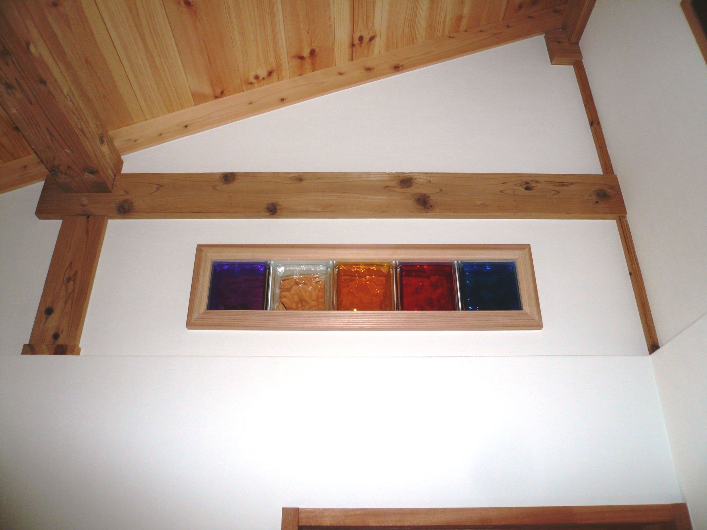 2階の壁には、上棟式の五色をイメージした五色の明かり取りを並べてみました。