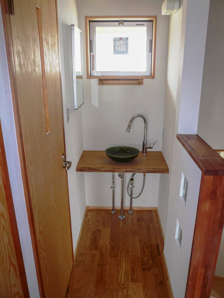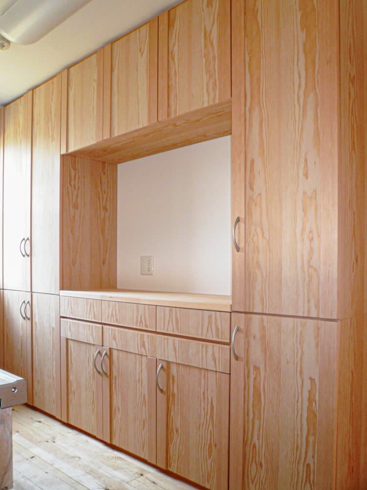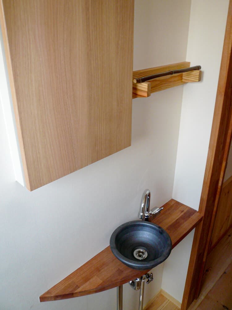 使い勝手を考え、居間の作り付け収納や木製システムキッチン、手洗いの収納なども私が手作りしました。外からはスッキリ見えるよう板戸で施工し、シンプルに仕上げています。