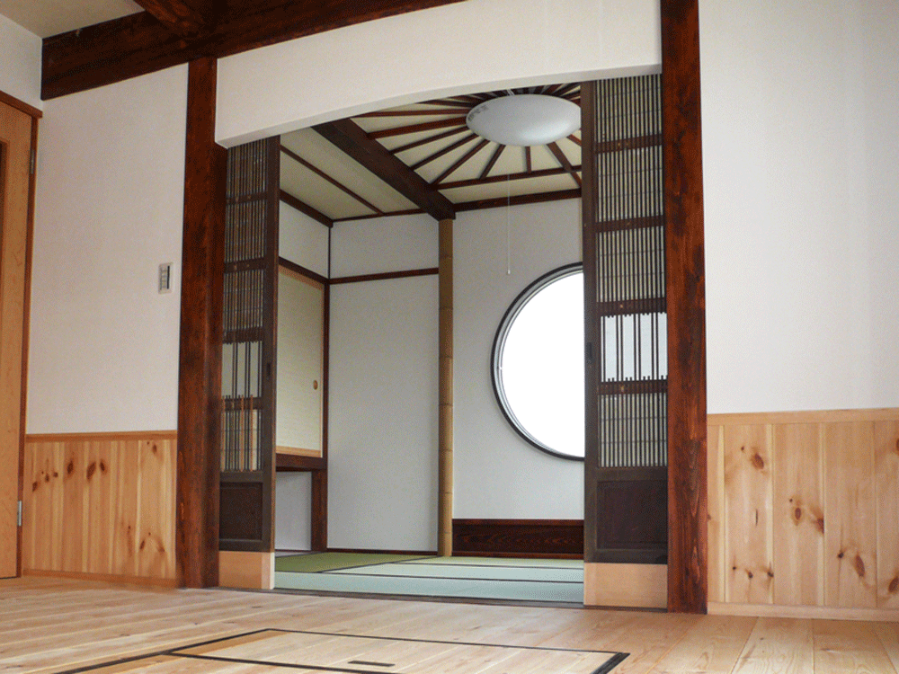 和室には特に遊びを取り入れており、天井は太陽のイメージに。丸窓は月をイメージして、地板を水面に見立てました。