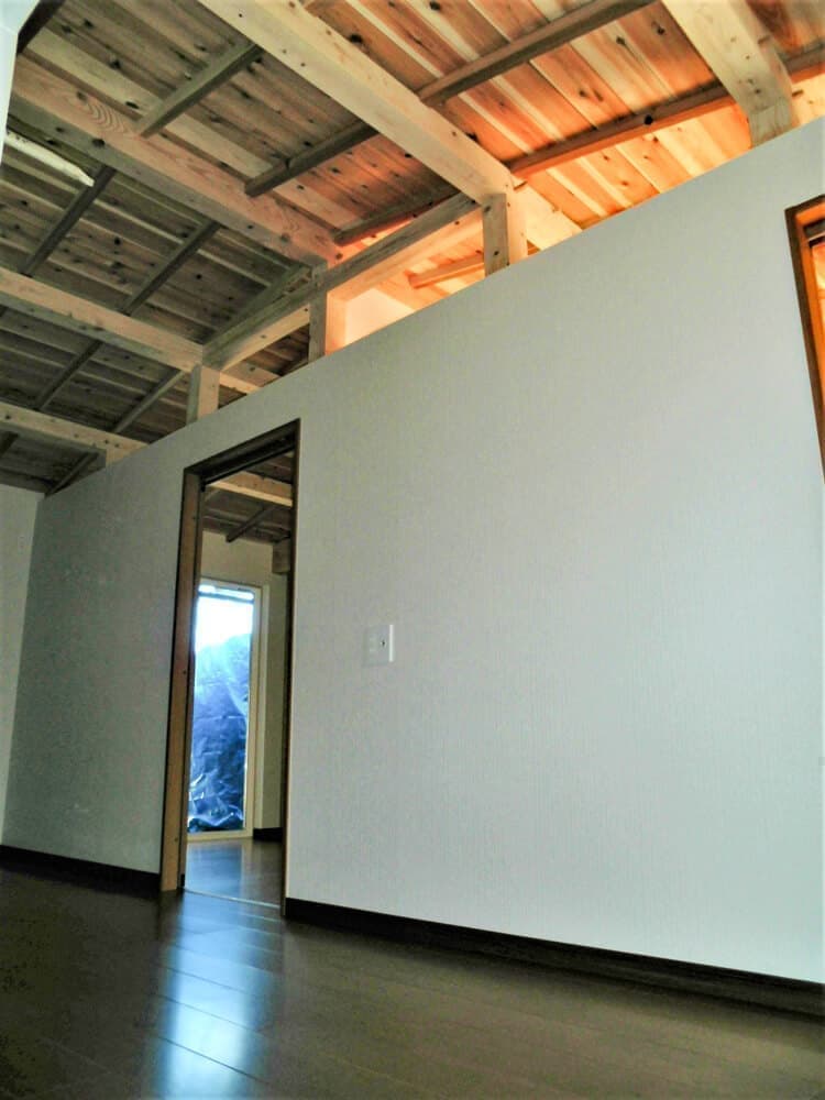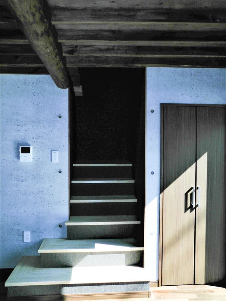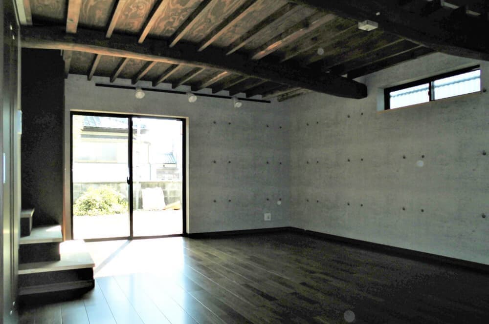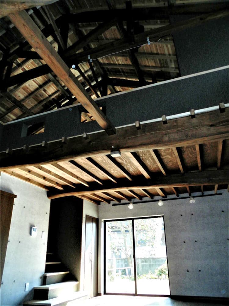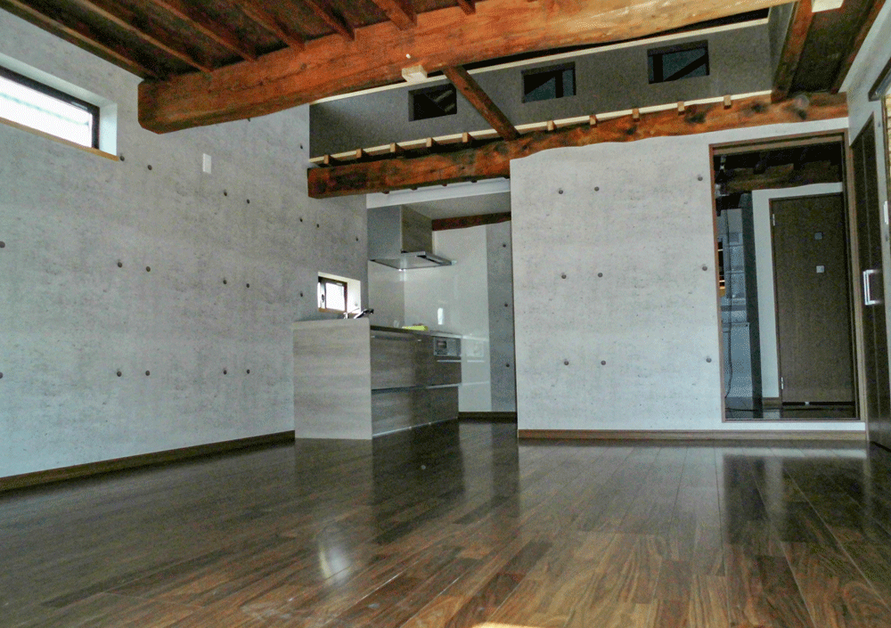 内壁のコンクリートのシャープな印象やダークな色合いはお施主様のご希望通り。昔からの小屋組みに油を塗ってそのまま見せた吹き抜けは見応えがあります。