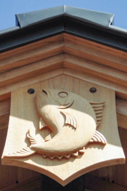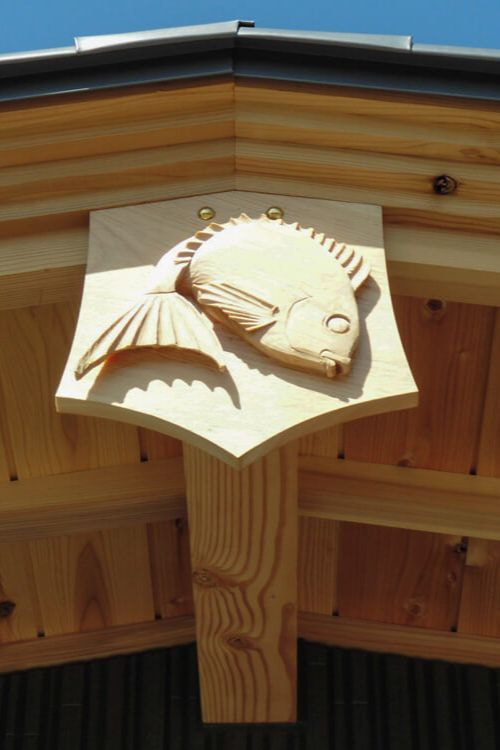 隣接する店舗で魚屋を営まれているご家族なので、遊び心で2箇所の屋根中央に魚の彫り物を取り付けています。縁起のいい鯛、そしてマグロで有名な店なのでマグロを彫ってみました。これは寺社仏閣の屋根の破風板につける懸魚(げぎょ)という妻飾りを模したものです。懸魚は本来、火災除けの意味から水に強い魚型だったといわれています。