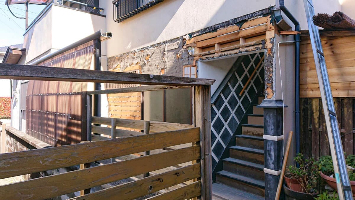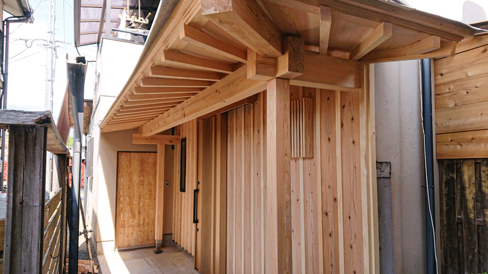 化粧屋根かけの「扇垂木」という手法を試したくて、自宅の玄関部分をリフォームしました。多数の垂木を扇のように放射状に配する寺社建築の技です。